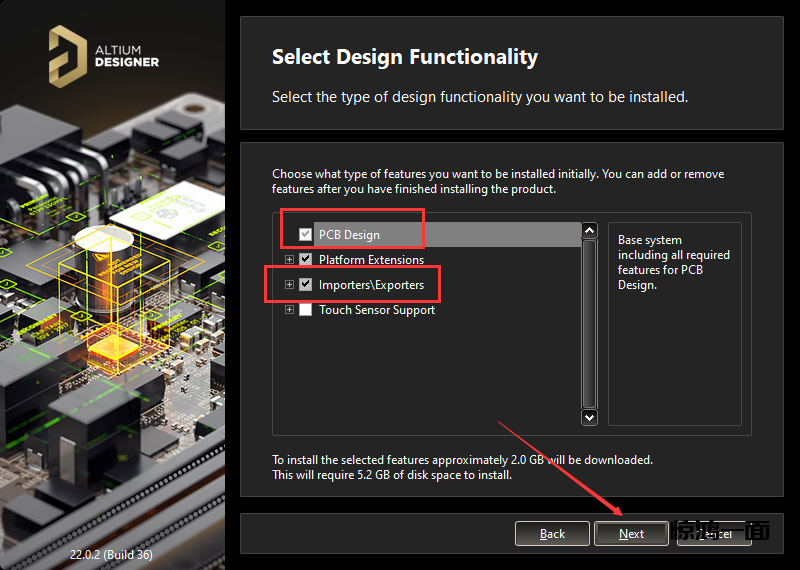 4.一般选择安装“PCB Design”、Importers\Exporters 两项即可,再点击Next