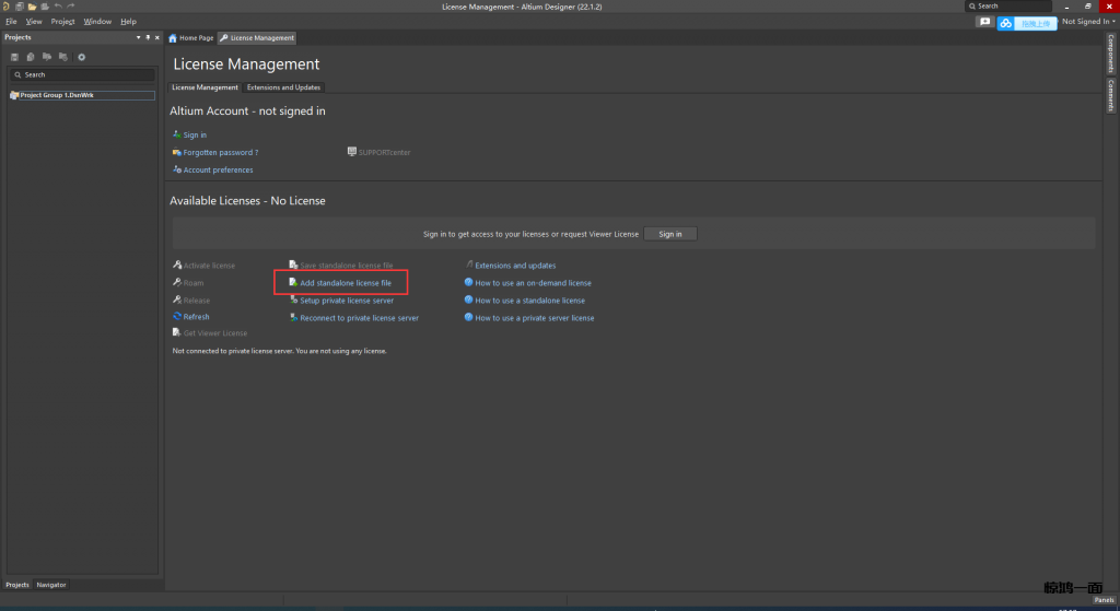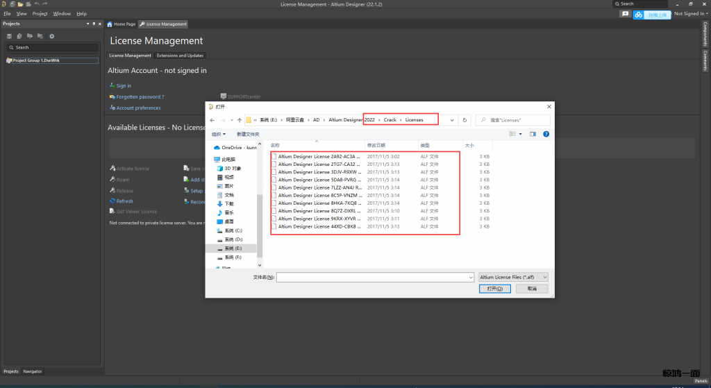 4.找到你安装包下载目录 *\Altium Designer 2022\Crack\Licenses 下的文件,选择一个许可证文件,点击打开