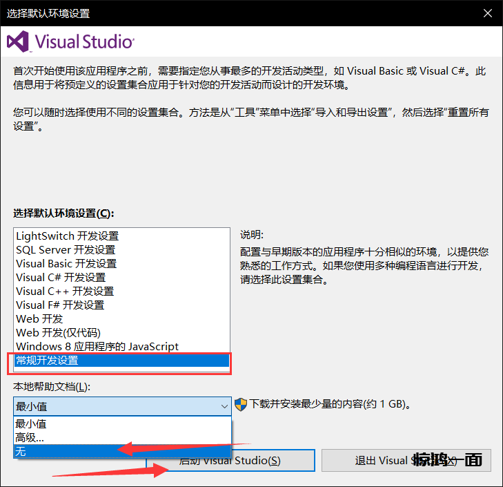 6.一般建议选“常规开发设置”,本地帮助文档选择“无”,再启动