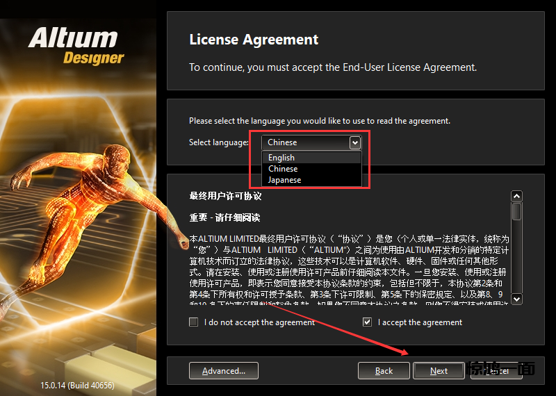 3. 按照需要设置语言,之后勾选 I accept the agreement,最后点击 Next