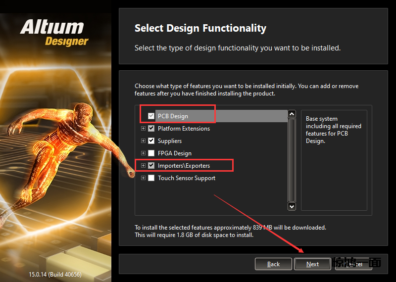 4. 一般选择安装 “PCB Design””Importers\Exporters” 两项即可,再点击 Next