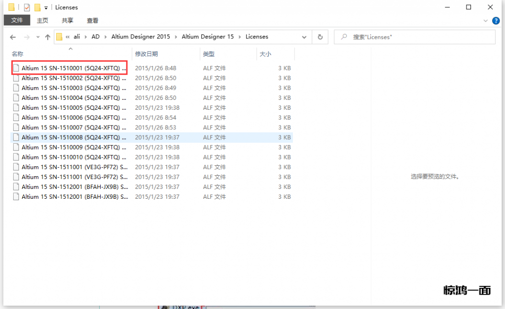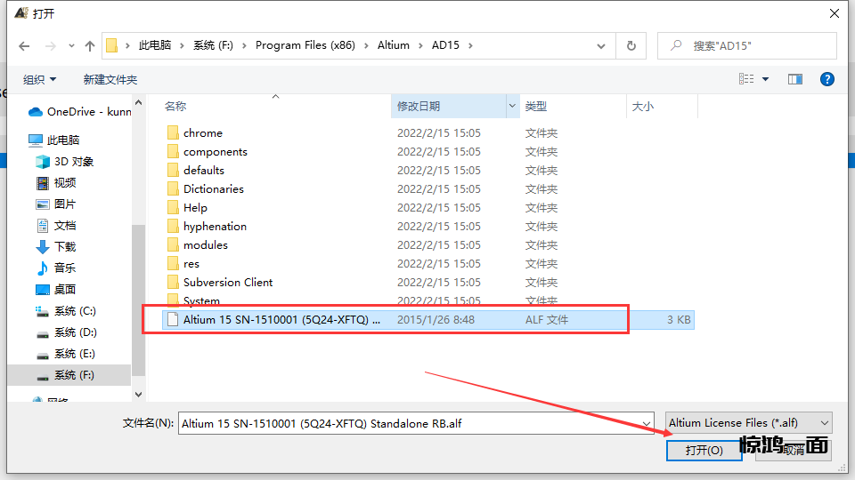 10. 在软件的安装目录下找到刚刚复制过去的文件 Altium 15 SN-1510001 (5Q24-XFTQ) Standalone RB 文件,选中然后点击打开