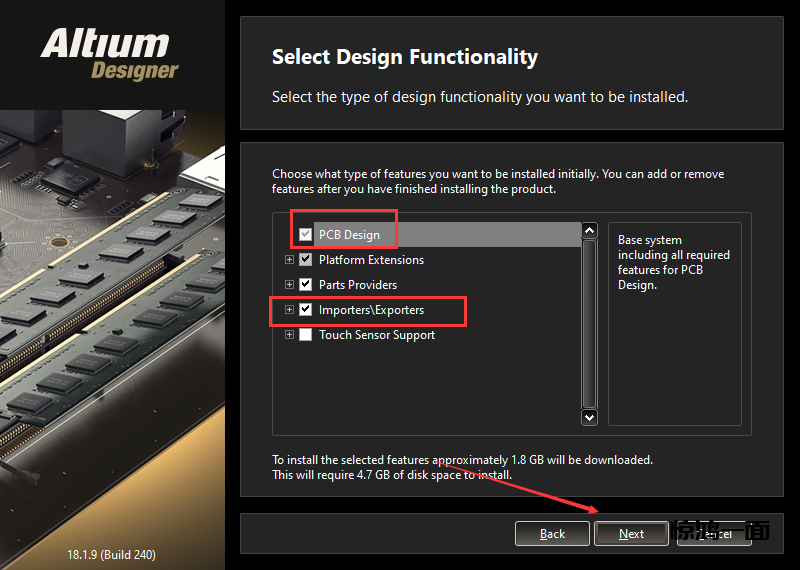 4. 一般选择安装 “PCB Design””Importers\Exporters” 两项即可,再点击 Next