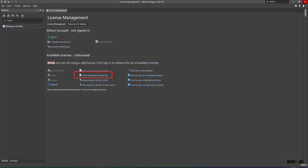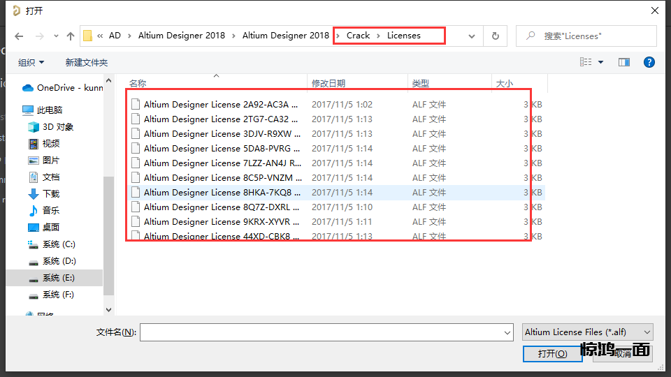 6. 找到你安装包下载目录 *\Altium Designer 2018\Crack\Licenses 下的文件,选择一个许可证文件,点击打开