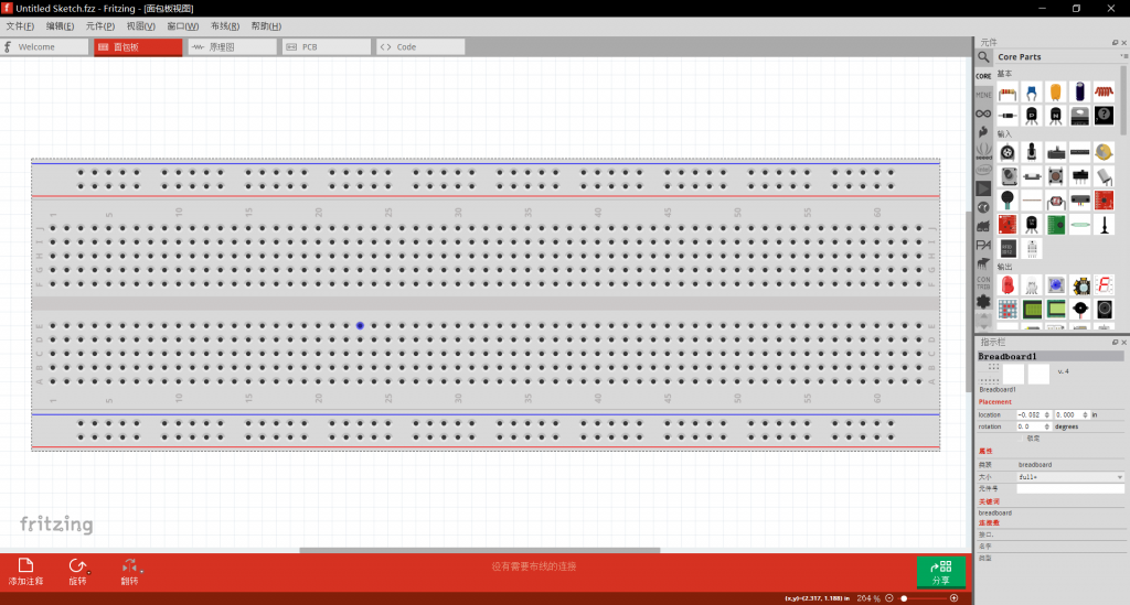 Fritzing是一款支持多国语言的电路设计软件,有4种视图,分别是——面包板、原理图、PCB和Code。用鼠标单击就能轻松切换!其中,对于前3种视图(面包板、原理图和PCB)而言,无论你在其中的哪一种进行电路设计,软件都会自动化同步其他两种视图,还可以生成制版厂生产所需要的Greber文件、PDF图片和CAD格式文件。这一切都极大地推广和普及了Fritzing的使用!