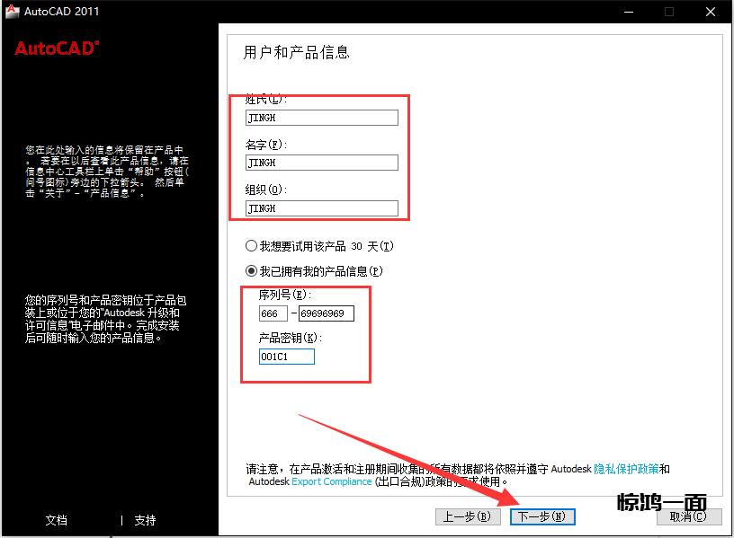 6.姓氏,名字,组织,随便填入,序列号填入666-69696969 密钥:001C1 再点下一步